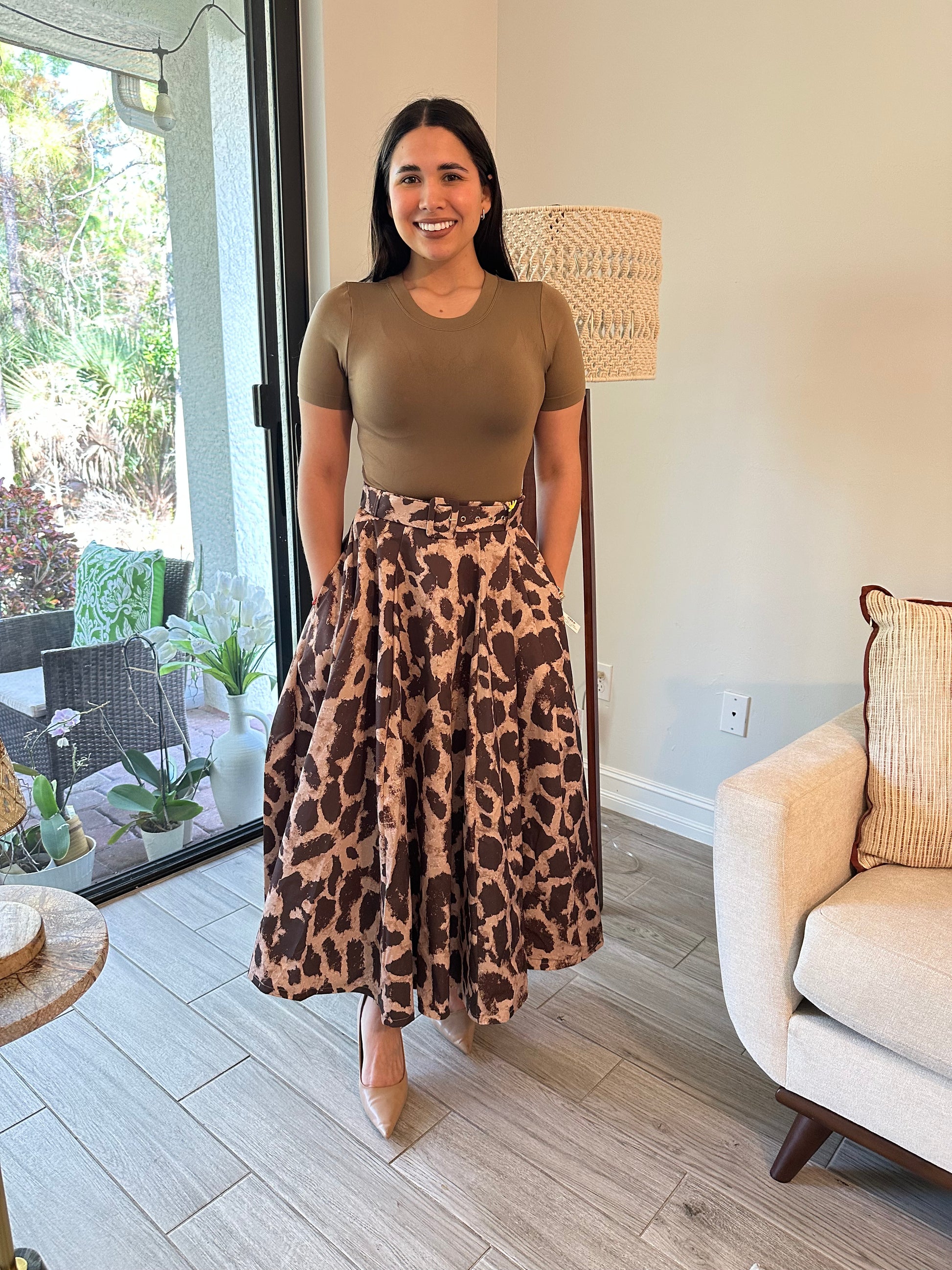 Animal print skirt with pockets and belt, has a zipper on one side.